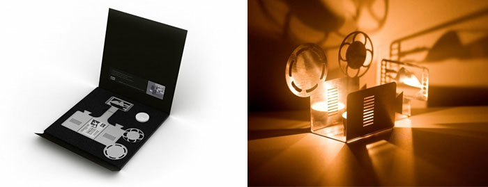 | Industria Nacional and Dialogo Design created this special invitation for the Vivo Brazilian Movie Awards which folds up to create a candle-lit film projector. |